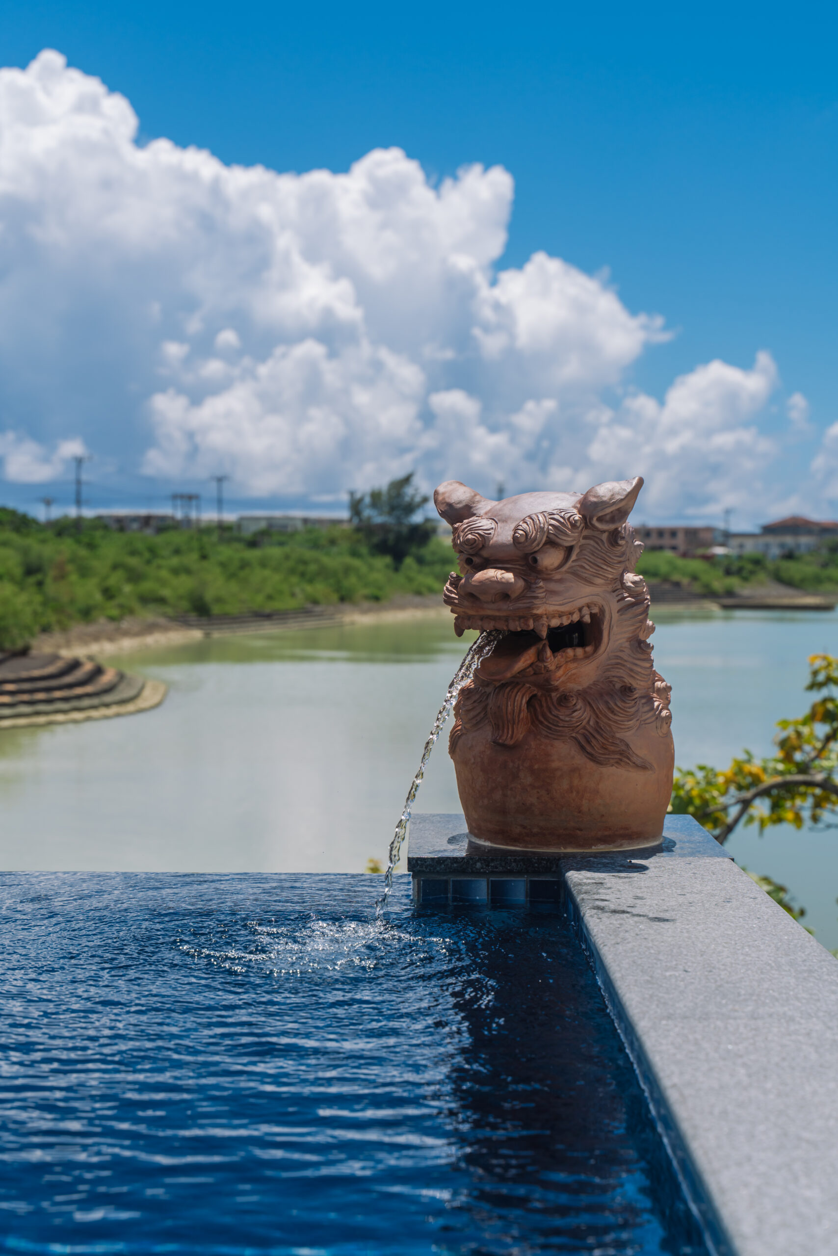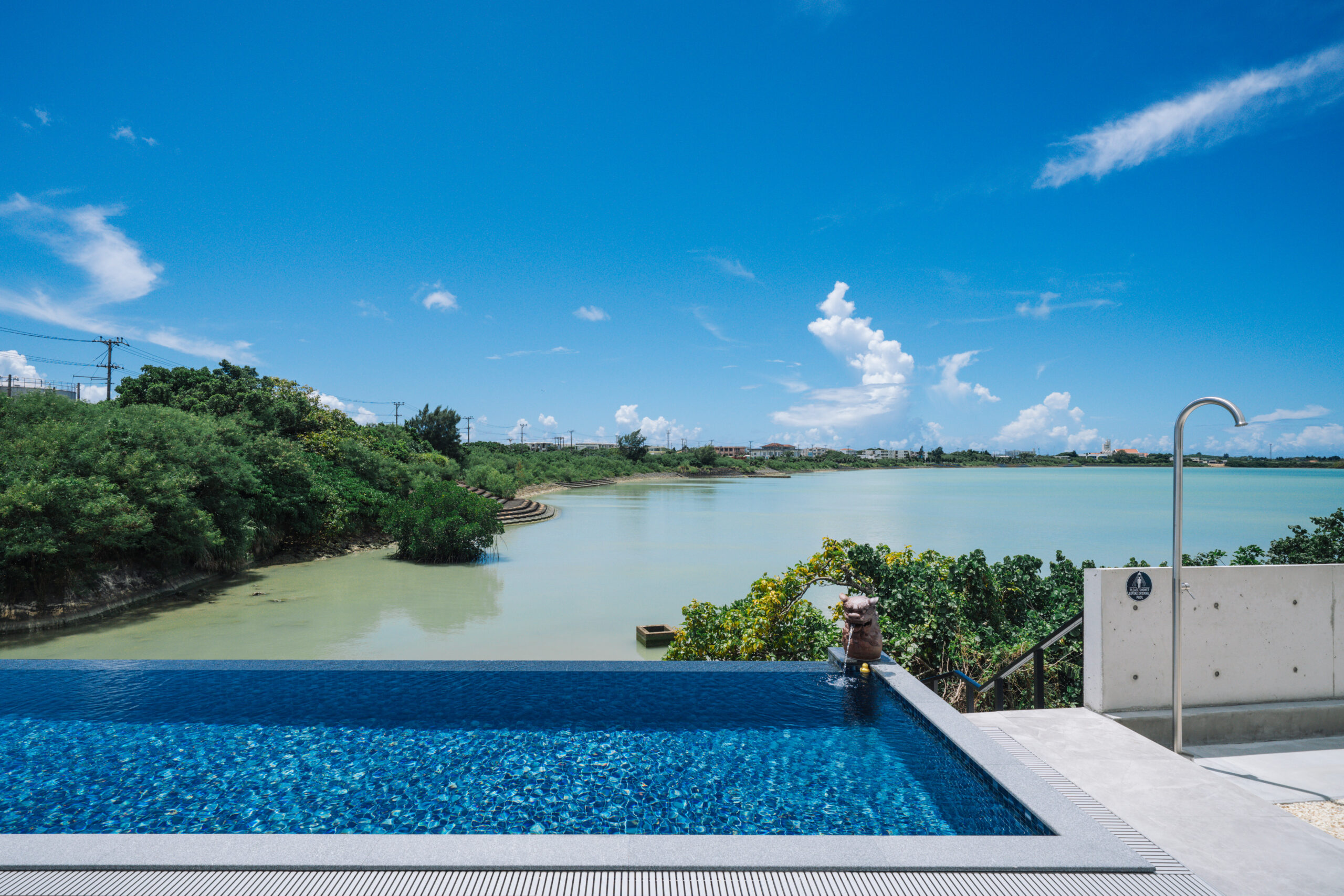 10mのインフィニティープールでは、フォトジェニックな“口から水を吐くシーサー”がお出迎え。このシーサーは、“人間国宝 金城一門”の「金城陶芸」による特注作品で、プールに個性的な彩りを添えています。また、軟水器を通した肌に優しい水を使用しているので、安心して心地よくご利用いただけます。