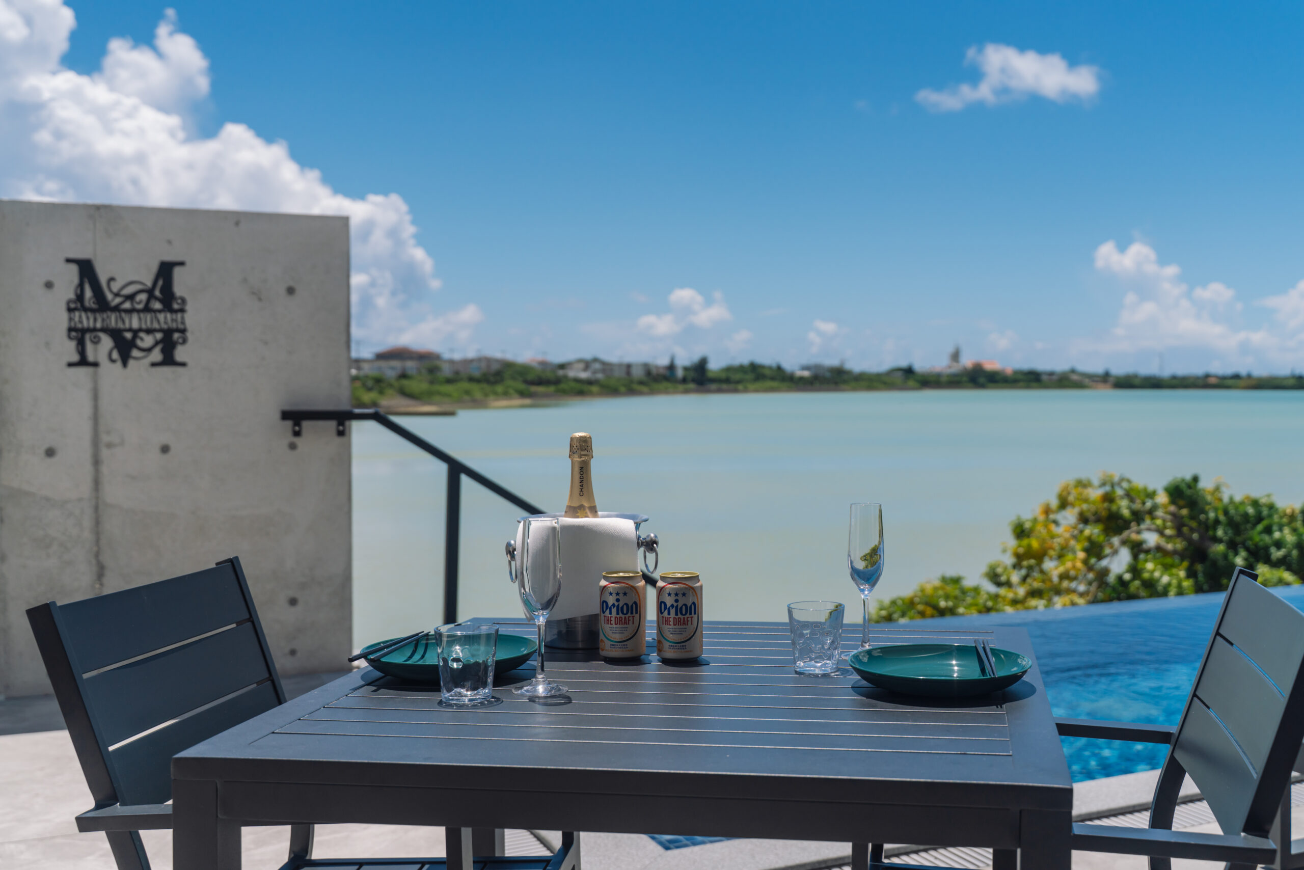 6人掛けの大型ソファとダイニングテーブルをご用意。プール越しに広がる与那覇湾を眺めながら、贅沢なお食事やくつろぎのひとときをお楽しみいただけます。